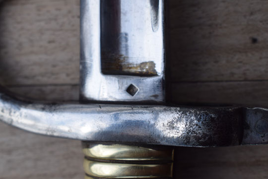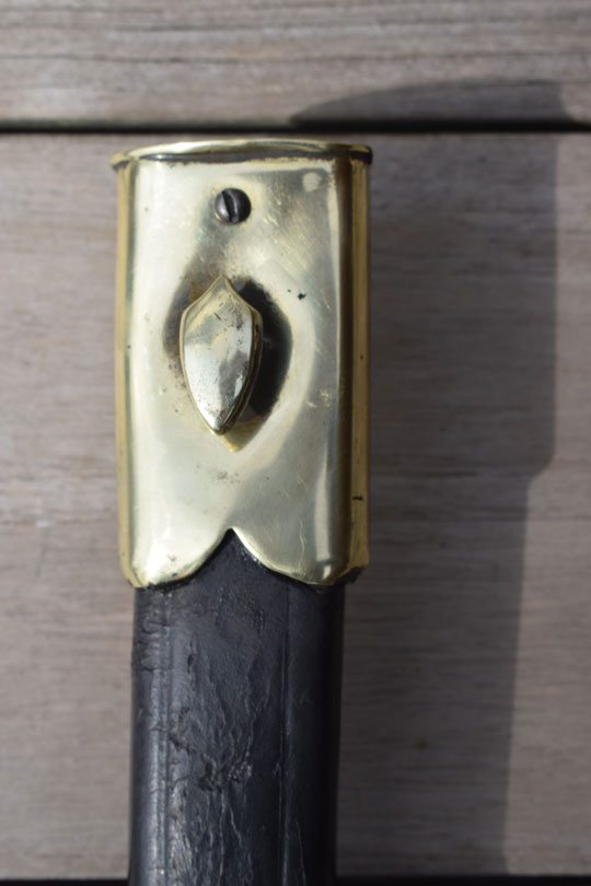 Excellent and correct rare black tooled leather Civil Guard scabbard with a brass top mount and a brass chape. All stitches intact and no serieus dents to the mounts. Frog stud in the shape of a shield.