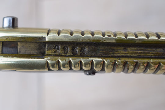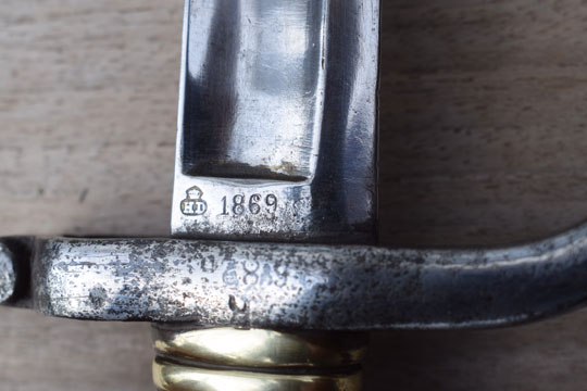 Belgian M1868 Civil Guard carbine, M 1870 Comblain system. Rifle number: 2952 in the mortise slot. Excellent long fullered bright finished yatagan blade with the typical Belgium inspection marking: Crown over HD in a trilob, followed by the year of production: 1869 on ricasso. P in a diamant shape on the reverse side. The blade shows two small spots of fine staining only. Excellent single piece brass hilt with much more rounded pommel then a Chassepot bayonet. External square spring fixed by a screw. Crossguard with small stains only, is Civil Guard marked: R over 6826. Muzzle ring MRD 17.2 mm and fastening screw on top. Slot is marked with a small C in a circle. Fast forward swept quillon with marking on the final : P in a diamant shape.