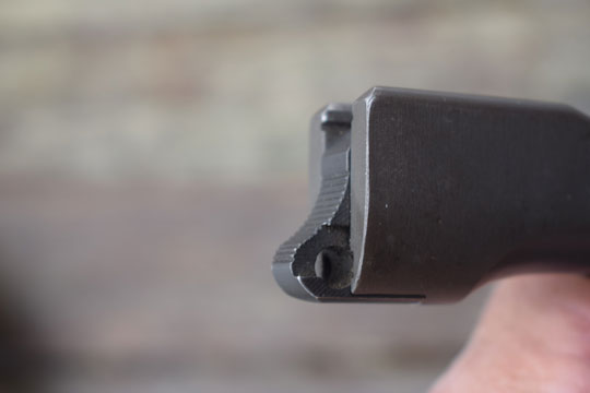 Belgian FN FAL rifle, 7.62 mm NATO. Minty bright finished blade with large false edge, first 3,5 cm parkerized. . Excellent light wooden grips secured to the blade tang with two screw bolts and washers. Blackened pommel and catch with a small ring. Blackened crossguard and a muzzle ring with a 2 prongs flash hider. MRD 15 mm.