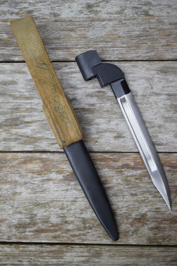 ee Enfield 303 no.4 MK I. rifle and PM Sten MK 5. MINTY bright finished fullered blade with Bowie tip. First 1.5 cm blackened and /I\ marked. Blued socket marked: T6R Top of the socked is marked P in circle (=Poole Arsenal) and 1949 and another /I\ on the lock.