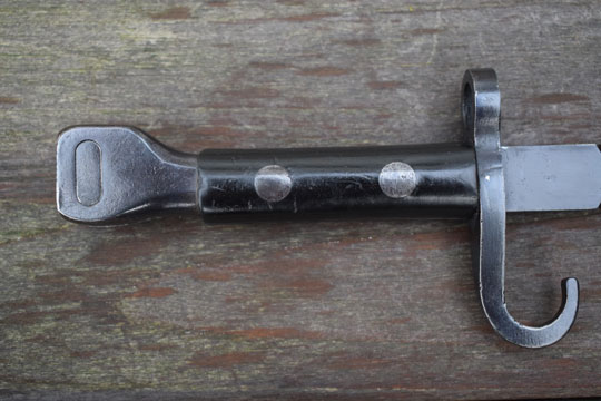 Mannlicher M 1895 Colonial (KNIL = Dutch Indies army) rifle and carbine. No Serial number. Excellent dark blued double edged slim blade with Austrian makers trade mark: OEWG on the ricasso and a Dutch inspector mark: Crown over S on the reverse side. Excellent+ blued square pommel and crossguard with a hooked quillon and a muzzle ring: MRD 14.5 mm. Excellent and rare black composite trials grips secured to the tang by two large steel rivets.