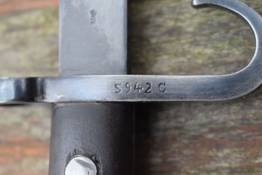 Mannlicher M 1895 Colonial (KNIL = Dutch Indies army) rifle and carbine. Serial number: 5942 C on the crossguard ricasso. Excellent dark blued double edged slim blade with Austrian makers trade mark: OEWG on the ricasso and a Dutch inspector mark: Crown over S on the reverse side. Excellent+ blued square pommel and crossguard with a hooked quillon and a muzzle ring: MRD 14.5 mm. Excellent wooden grips secured to the tang by two steel rivets.