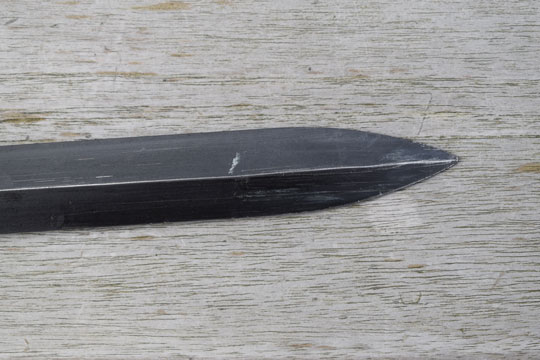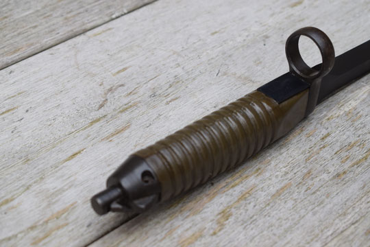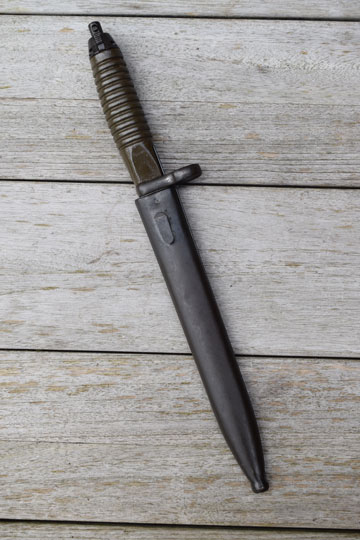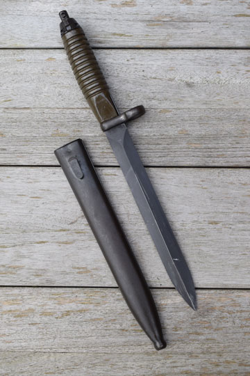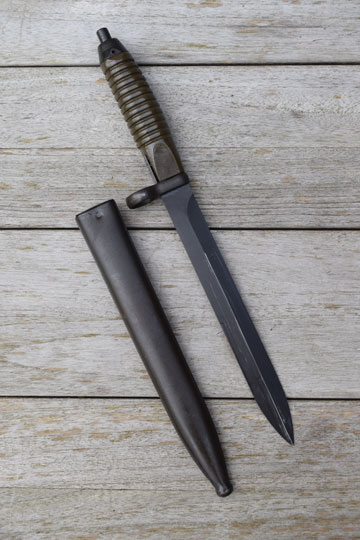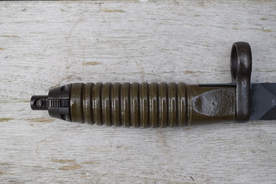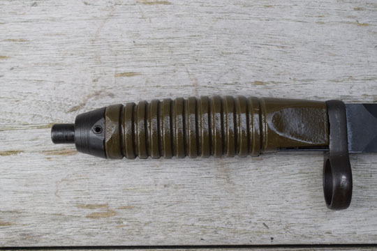 G3A6 Heckler & Koch automatic rifle. Minty long blackened double edged blade with no markings. Excellent two pieces 12 ribs lackened green plastic grip. Blackened crossguard with a large muzzle ring: MRD 22 mm. Posforised steel pommel with a standard G3 slot.