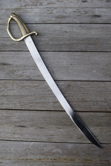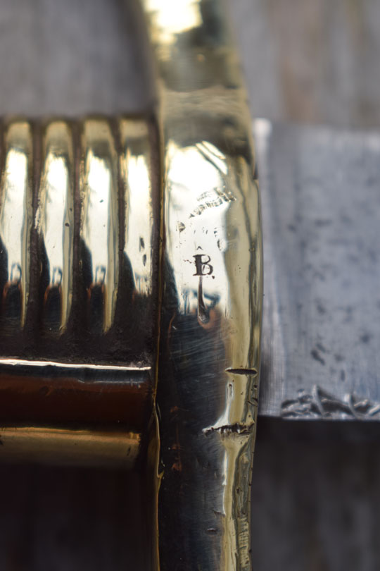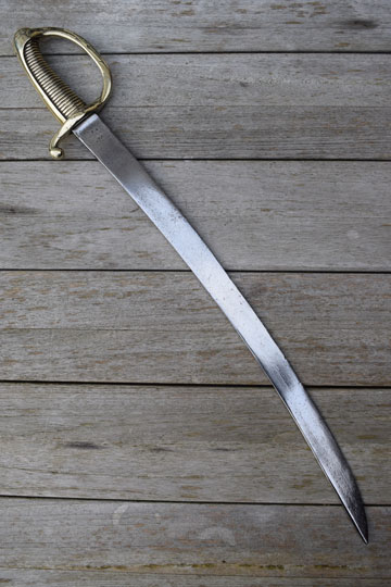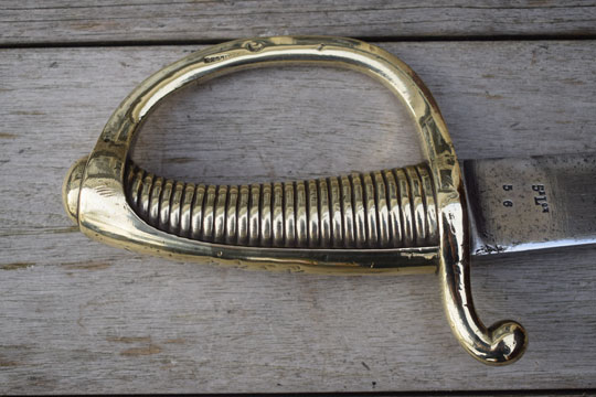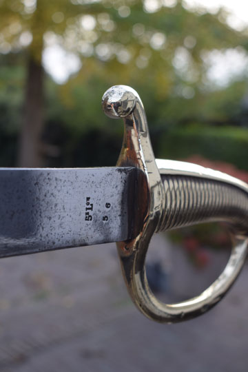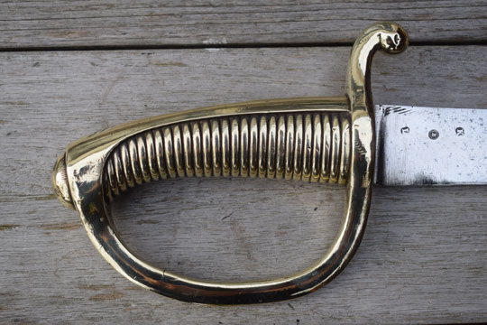 Excellent heavy one piece brass hilt with a single hand guard and a forward swept quillon. Grip with 28 fine ribs. Crosguard is B marked. back of the hilt shows some small indentations only. Left side of the hand guard is maker marked: VERSAILLES (= Versailles Arms Manufacture.- Director Nicolas Noel Boutet 1804- 1818 ) and shows two more French inspection markings: N and a *B marking.
