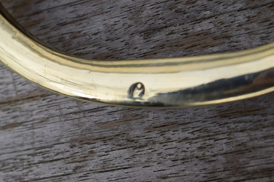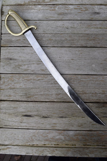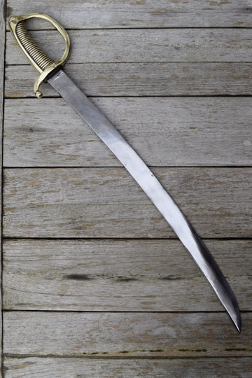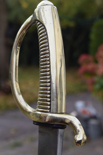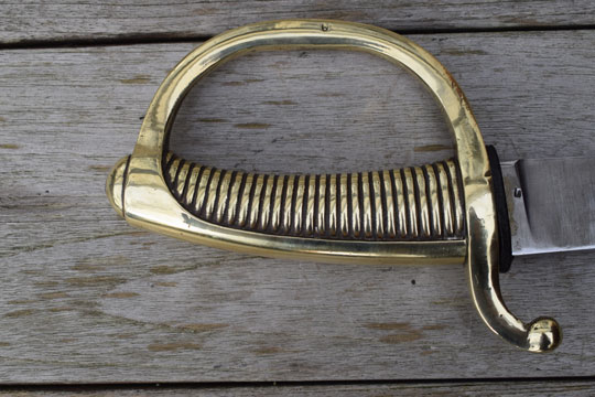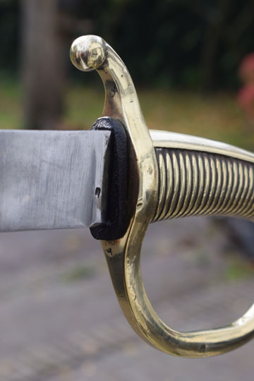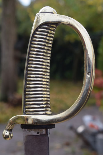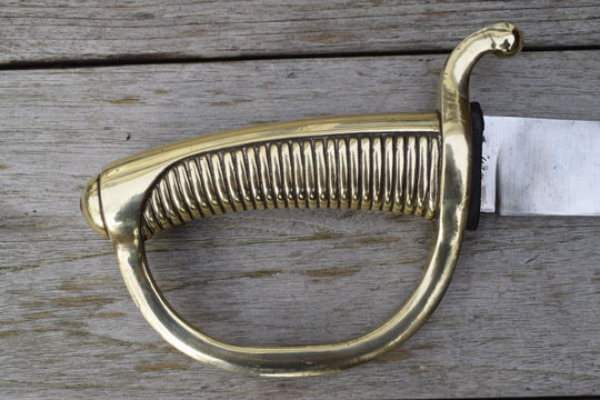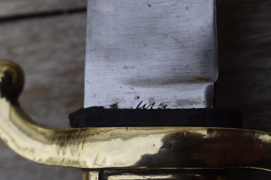 Beautiful heavy one piece brass hilt with a single hand guard and a forward swept quillon. Grip with 28 fine ribs. Crosguard is marked wit a T facing the blade. Left side of the hand guard is marked with another French inspection marking. Dot over L in a box.