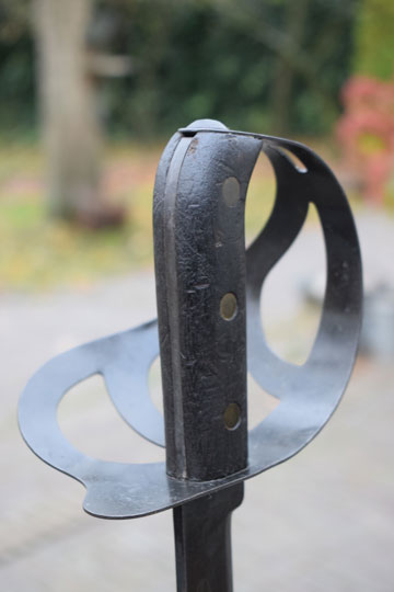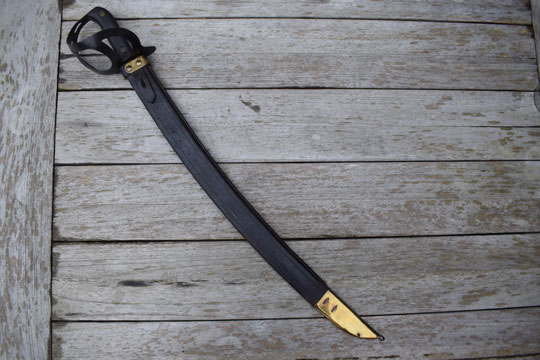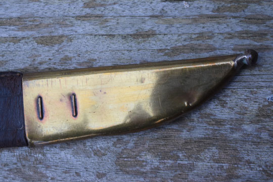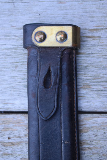 Excellent and correct tooled brown flexible leather scabbard with a brass cuff. The cuff is fixed to the throat by 4 round brass rivets. Brass chape fixed by 4 staples. Round finial. The scabbard is sewed on the side and not on the back side. Integral brown leather frog strap.