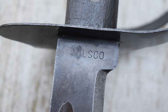 US M 1917 Navy Cutlass / "Nederlands O.I. klewang M 1941"/ Dutch N.E.I klewang /cutlass M1941. Excellent parkerized crudely made fullered klewang blade with a clip point. Edge of the blade is factory sharpened. The ricasso is US maker marked: MILSCO (= Milwaukee Saddlery Company. Milwaukee Wisconsin. USA) Hilt with a wide open blackened steel hand guard. Excellent two piece wooden grip secured to the blade tang by three brass rivets. Split in top of the guard.