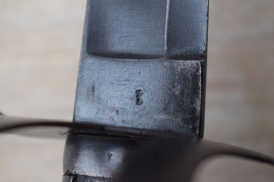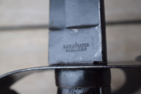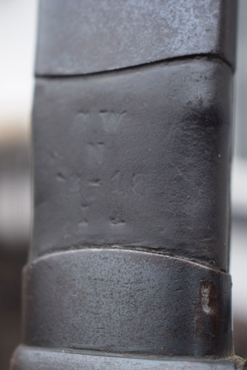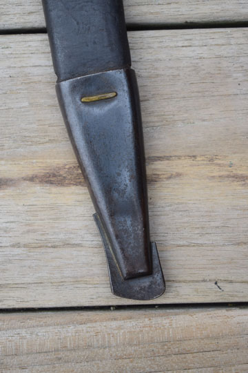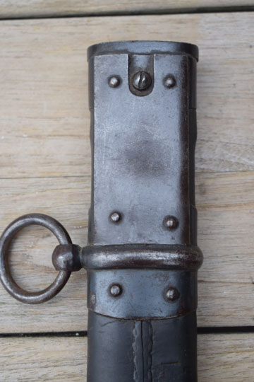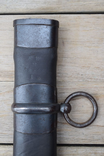 Excellent thick black leather scabbard with a blued throat, a blued single loose hanging ring and a blued chape. Leather body is marked and dated between the throat and the hanging ring: G.W. over N over 3 - '18 and I.N. All stitches intact and a small dent to the backside of the chape only.
