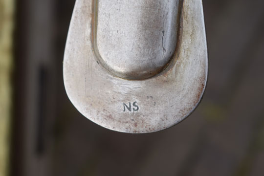 Excellent++ all steel bright finished straight scabbard with two loose hanging rings. No dents. Drag is marked: AM and on the reverse: NS.