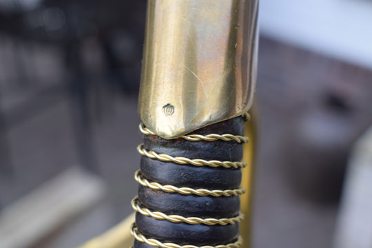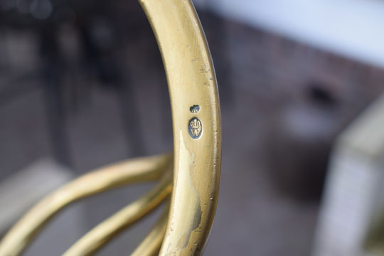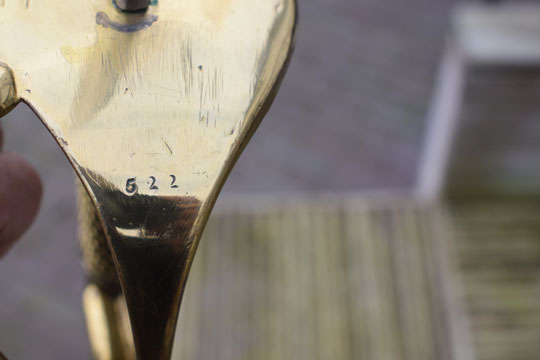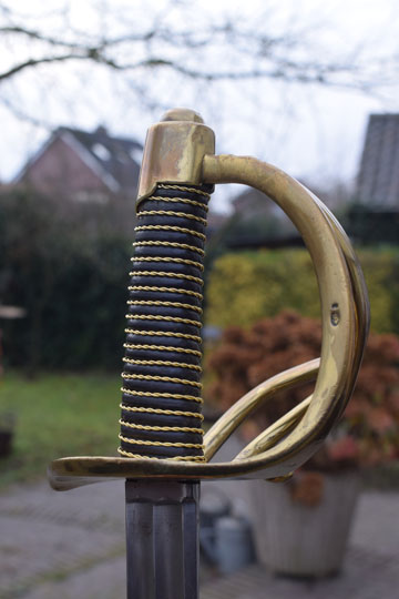 "Nederlands zware cavalerie manschappen sabel, Model No.3, M 1814 "/ Dutch Heavy Cavalry (HC) troopers sword M 1814, Model No.3. Superb straight double fullered blade with a clip point. The ricasso is dated: 1823 and a Crown. Spine is marked: Crown over JP. (=Inspector Jean Joseph Peck). Brass hilt with brass hand guard , 3 side bars and a brass pommel. Hand guard is marked: Crown over W. on the side bar. Inside of the hilt is marked: Crown over JP. Outside of the hilt is marked with a Unit number: 522. Round wooden grip is covered with excellent black horse leather and an intact twisted brass wire winding.