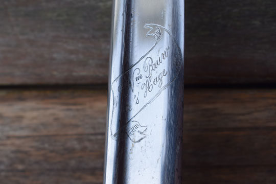 The left ricasso shows the name mark of the German maker: Crown over Z in shield (= H. &. W. Lang- Solingen 1840-1860. After 1860 this trademark was taken over by Clemen & Jung -Solingen. ) and an old style Dutch quality proof mark: Eisenhauer in a scroll. The reverse side is crisp marked with the Dutch retailers name and residence in a scroll: Wm. Pauw over te s'HAGE. (= Willem Pauwels, Westeinde 317-The Hague. 1814-1874)