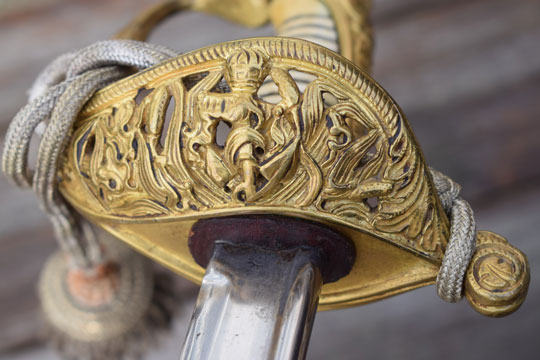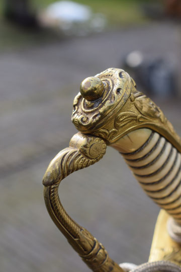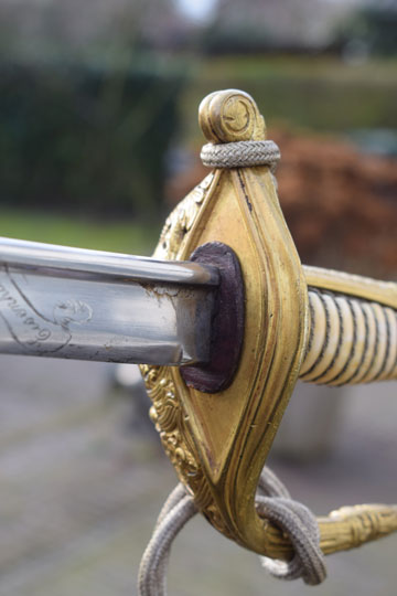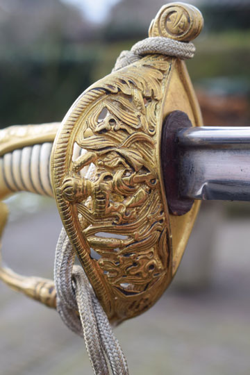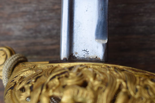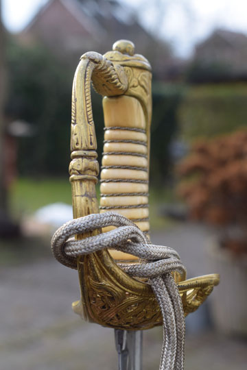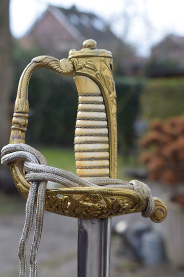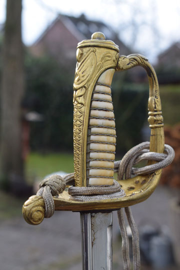 Beautiful detachable gilt hilt with a rich variation of ornaments. Ball top nut on the pommel. The gilt hand guard is pierced with a fouled anchor under a crown and beautiful floral motives. The white ribbed ivory grip is in an excellent condition. It has a complete silver wire winding.