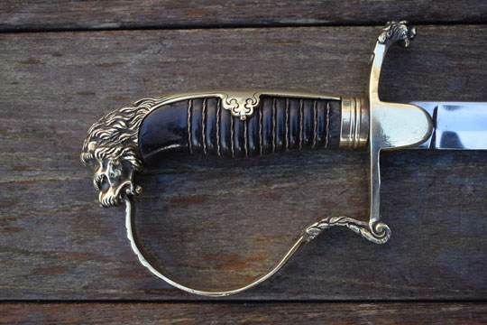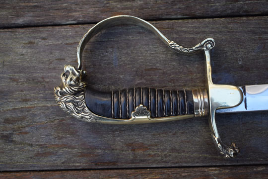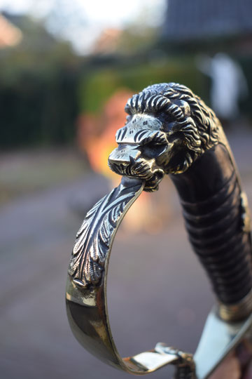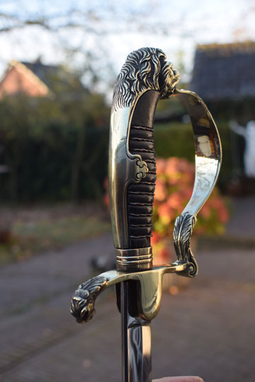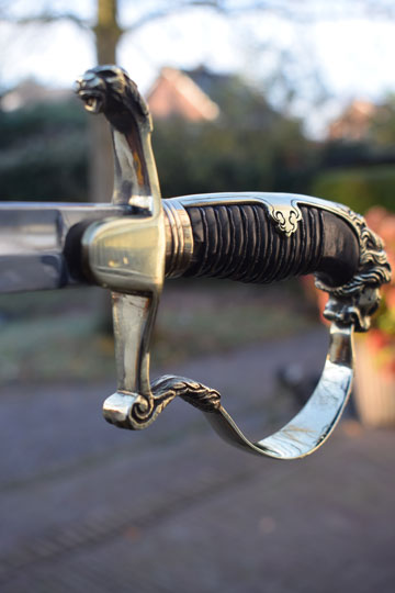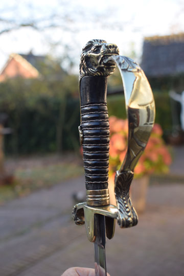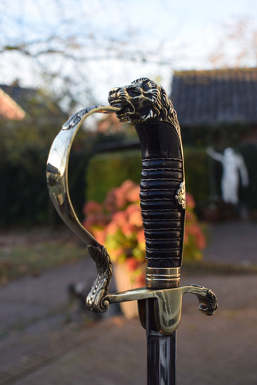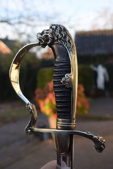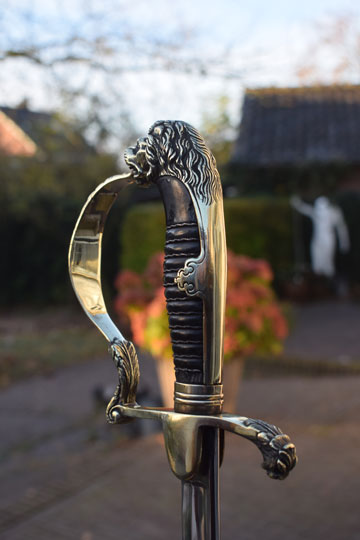 "Nederlands infanterie officiers "Buitenmodel sabel" M 1912 -Buitenmodel wandelsabel-" / Dutch M 1912 Infantry officers sword "Special Order model". Superb bright finished slightly curved fullered blade. Beautiful brass hilt with a older style lion head and knuckle bow. The brass back of the hilt with so called: "ears". Crossguard with forward swept quillon with puma head. Excellent black ebony grip with a single twisted silver wire winding. Some very small chips are missing of the ebony grip near the ferule only.