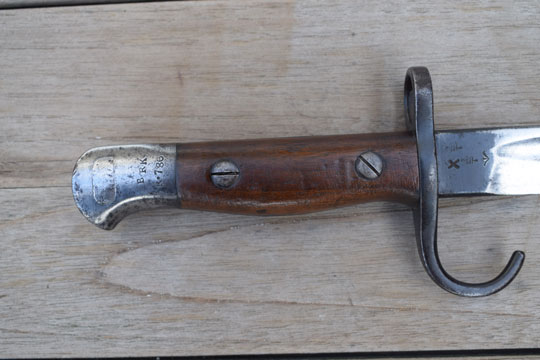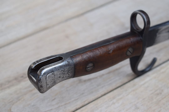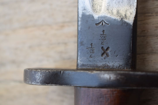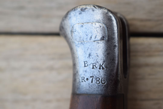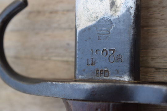 British Lee Enfield (SMLE) No.7 rifle. First pattern with hooked quillon and no oil hole in the pommel. Excellent bright finished blade. First 2 cm blackened. Ricasso is crisp marked with the English maker mark: EFD (=Enfield Arsenal) and Crown over ER over 1907 over a very crisp date: 11'08. Two clear British (Enfield) inspection marks, Crown over X5 over E. /I\, X, on the reverse side of the ricasso. Excellent blued pommel with muzzle ring and hooked quillon. MRD 16,5 mm. Pommel shows a crisp British unit marking: B R K over R. 786 (= The Princess Charlotte of Wales - Royal Berkshire Regiment, Rifle No. 786).