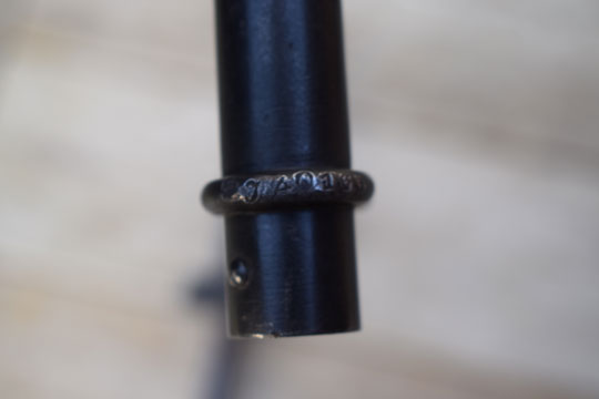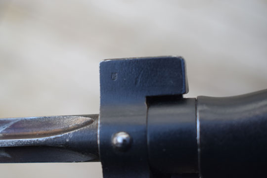 Lebel rifle M 1886 and further Lebel models. Bayonet model M1886/17. Serial number: FN 61230 on the crossguard. Minty long blued cruciform blade with no markings. Excellent blued steel grip (Not alloy!) detachable to the blade tang. Blued crossguard and muzzle ring MRD 15 mm., made without a guillon. Checkered press stud. Crossguard with on side side a tiny P. in shield inspection marking.