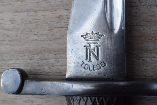 Spanish Mauser M 1941 and Mauser M 1943 rifle with a Ricchieri adapter. Serial number: 3998 over T on the ricasso. Excellent bright finished fullered bolo blade with a very crisp Spanish Toledo arsenal marking: Crown over FN over TOLEDO on the reverse ricasso.