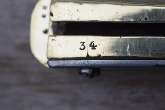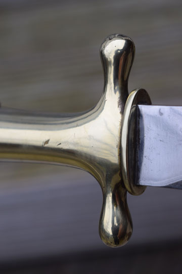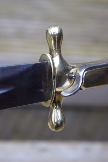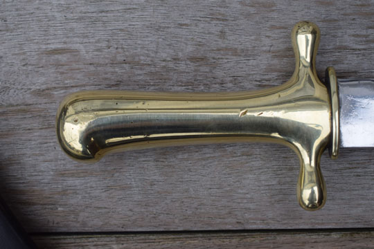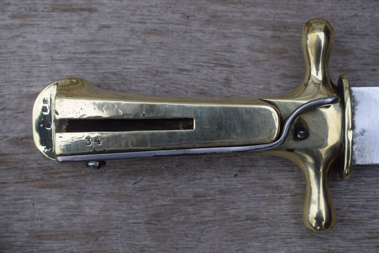 Danish M 1853 Navy rifle, M 1853/66 converted to a Snider system. "Hirschfanger bayonet" (Very low)serial number: 34 on the left side of the grip, close to the mortise. EXC- heavy long bright finished double edged claiva blade with short median fullers on both sides. A few spots of light pitting and some stains to the blade only. EXC+ massive brass hilt with two short olive shape straight guillons.Top om the pommel, is marked 83 9. Tiny inspection marking: H in a circle on the front side of the pommel. Another faint crown stamp on the pommel. Mortise slot on the left side of the hilt with a long steel external spring, fixed by a single screw.