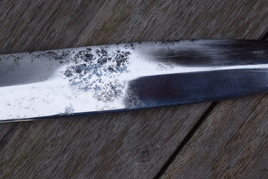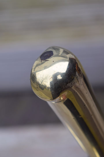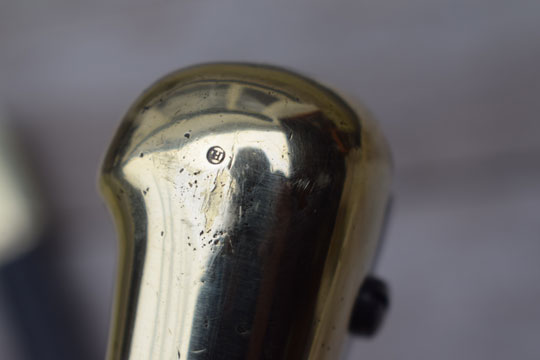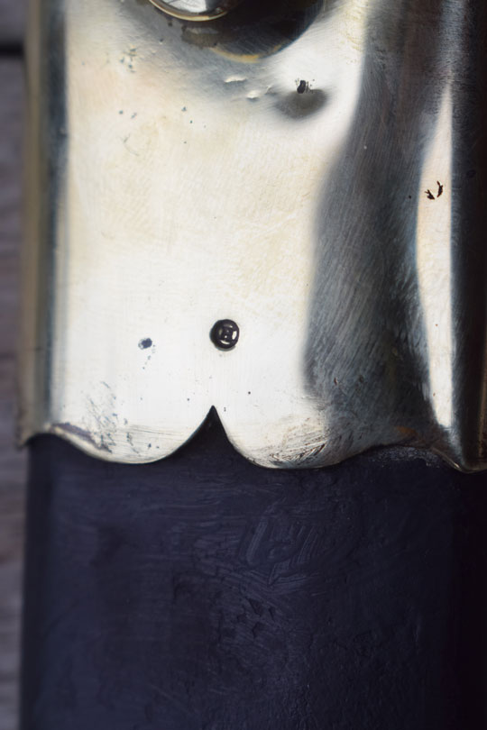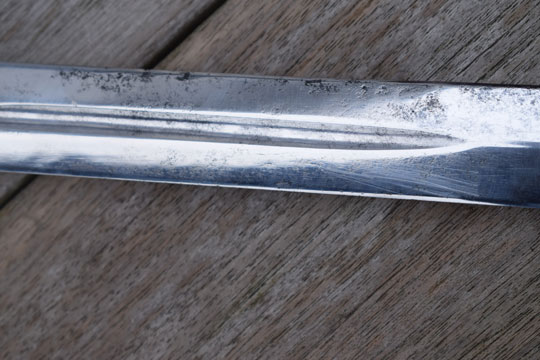 Excellent + Black leather scabbard with brass fittings. Top mount and chape are both marked with a tiny stamp: H in a circle. No serieus dents to the fittings and all stitches closed.