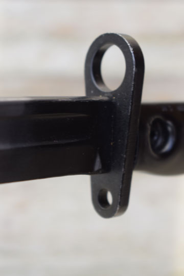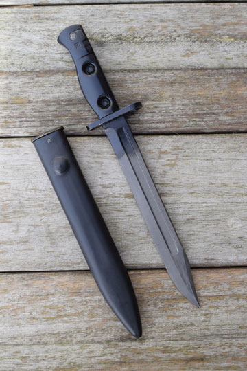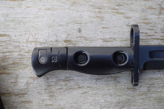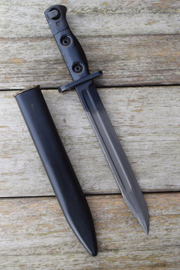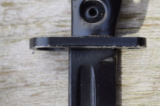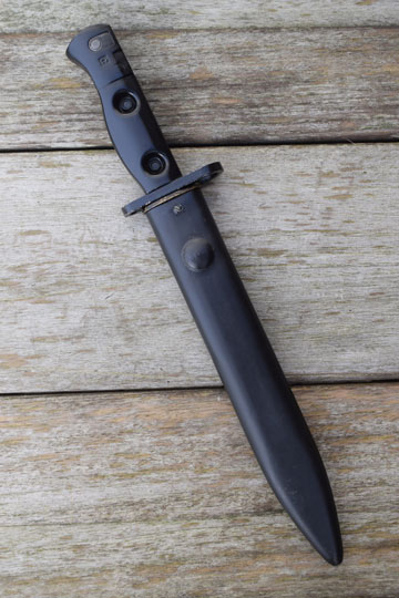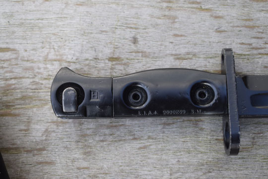 Last model of the L1 serial, introduced in the beginning of the 70. Only Hopkinson Ltd. of Sheffield made this L1A4 bayonet with a riveted pommel (and not brazed) and a different Bowie tip. (Also see the book: British and Common wealth bayonets from Ian Skennerton. Page 262.)