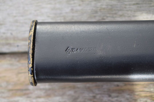 Minty and correct blackened steel No. 5 MK1 scabbard with round frog stud and brass throat, marked: H. in Diamant shape.78/I\ 9600278. No dents.