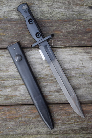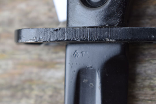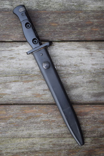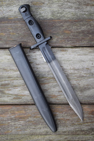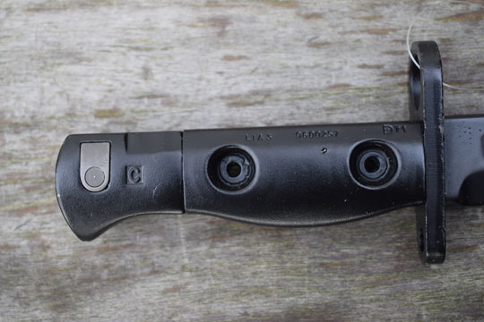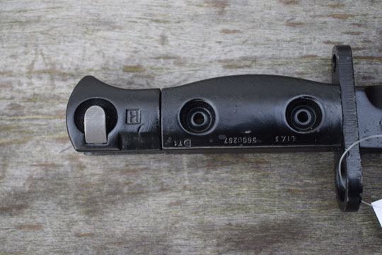 Last model of the L1 serial, introduced in the beginning of the 70. Only Hopkinson Ltd. of Sheffield made this L1A4 bayonet with a riveted pommel (and not brazed) and a different Bowie tip. (Also see the book: British and Common wealth bayonets from Ian Skennerton. Page 262.)