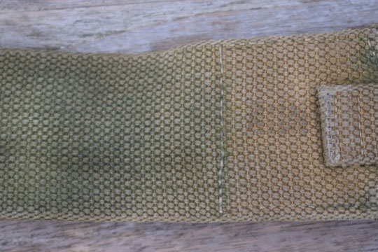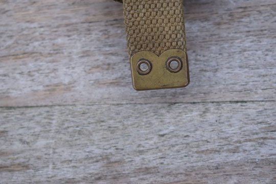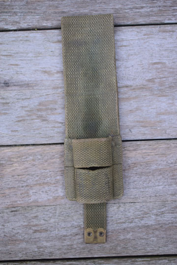 Pattern M 1908 webbing equipment belt frog. Excellent green webbing frog. Two brass rivets and a stitched short tool helve carrier tab with a brass tip. Reverse side faint stamped with a makers code.