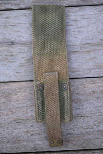 Introduced in 1909 and made by M.E.CO (= Mils Equipment Company). This is the first model (AC117) with brass rivets and a stitched short tab,.