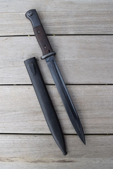 Portuguese German contract Mauser M84/98. Serial number: G 12740 on the crossguard. Blued fullered blade with no date, no markings and no makers name. Blued crossguard with no muzzle ring and pommel with T-O slot and Portuguese serial number on the crossguard. Two very crisp German Waffenambt markings: WaA833 on the pommel. Beautiful wooden grips fixed to the blade tang by screw bolts. Flash guard.