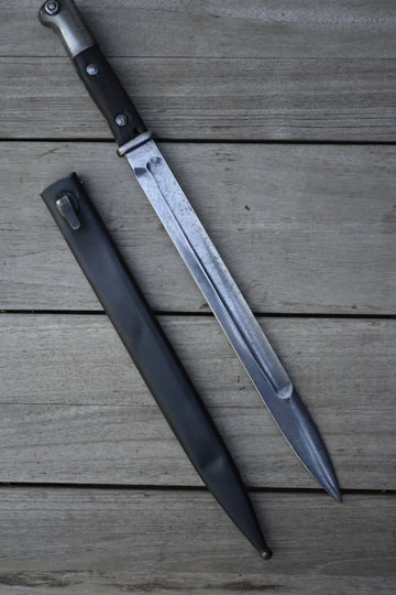 Mauser M98 rifle. Excellent bright finished fullered long blade. German maker's name: SAMSON WERK on the ricasso. German inspection mark crisp on blade spine Excellent bright finished pommel and crossguard. T-O slot in pommel and crossguard without a muzzle ring. Pommel shows a German inspection marking. Excellent wooden grips riveted to the blade tang. Oil hole in grips. No flash guard.