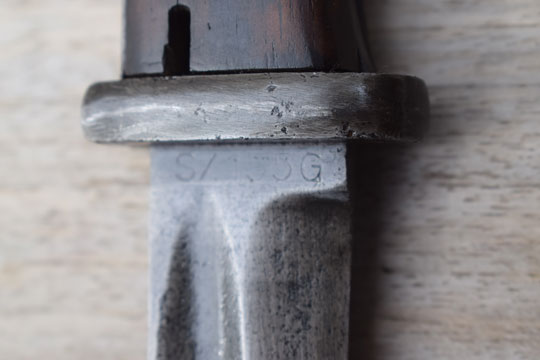 Norwegian re-used German M84/98 Mauser rifle and carbine. Serial number: 4837 over L on the ricasso. Re-used German 84/98 bayonet. Excellent blued blade with German makers secret code : S 155G (= E. u. F. Hörster - Solingen 1935) on the ricasso. Excellent blued pommel and crossguard. Pommel with removed German Waffenambt markings. Excellent wooden grips screwed to the tang with correct screws, washers and bolts. Left grip with the Norwegian Air Force rack number: 301. Excellent + parkerized steel scabbard with a Norwegian Air force Alice clip with US belt hooks fixed to the frog. Scabbard is maker marked: 41 agv and serial number: 1433.