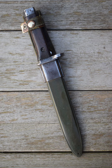 Correct US M4 style green plastic scabbard with lace hole in tip and blued metal throat. Lots of user spurs to the green plastic body. Green khaki belt loop with retaining strap is riveted to the scabbard. This is the original khaki belt loop. Many worn khaki belt loops are replaced by the Portuguese by leather belt loops.