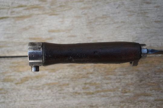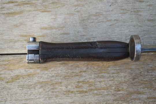 Dutch produced Armelite AR10 automatic rifle. Serial number: 76 on the left side of the wooden grip. Excellent blued double edged blade with long false edge. Ricasso shows the Dutch makers logo: AI in a triangle(=Artillerie Inrichtingen - HEMBRUG) Blued pommel with T-slot and crossguard with muzzle ring MRD 21.5 mm. Excellent- one piece wooden grip wraps around the blade tang and is secured by two small screw bolts.