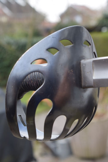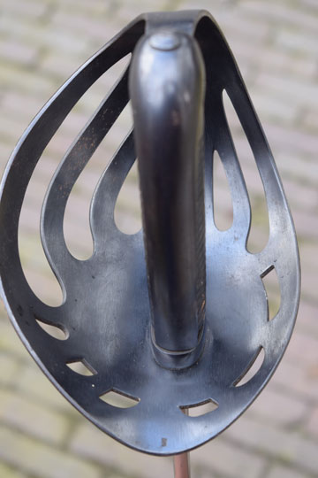 Excellent++ dark blued large pierced bowl hand guard with 7 side bars. Inside of the guard with Dutch inspection mark: Crown over B (= Inspector E.B. Broissois). Dark blued detachable hilt with a rounded pommel and an Excellent+ fine ribbed wooden grip covered with black horse leather. Marked nut on the top of the pommel.