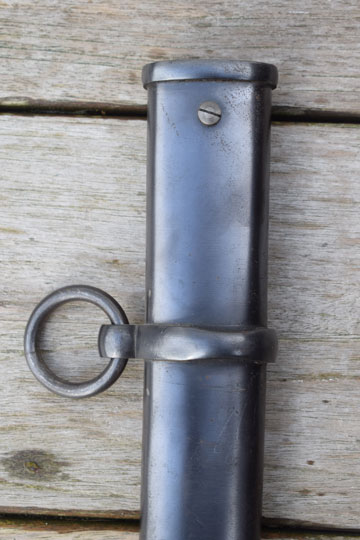 Excellent++ deep blued steel scabbard with a single loose hanging ring and no dents. Drag is crisp marked: Crown over B (= Inspector E.B. Brossois)