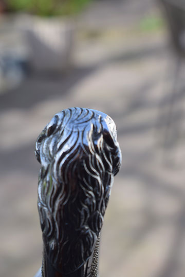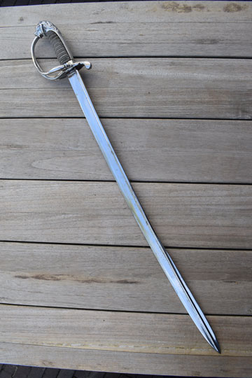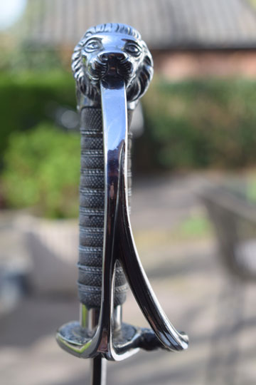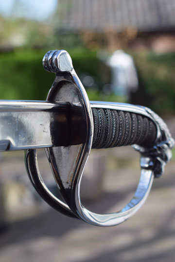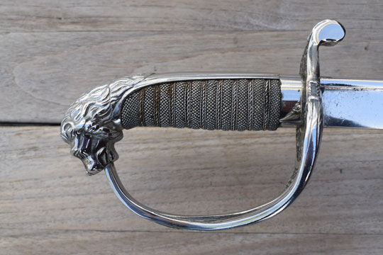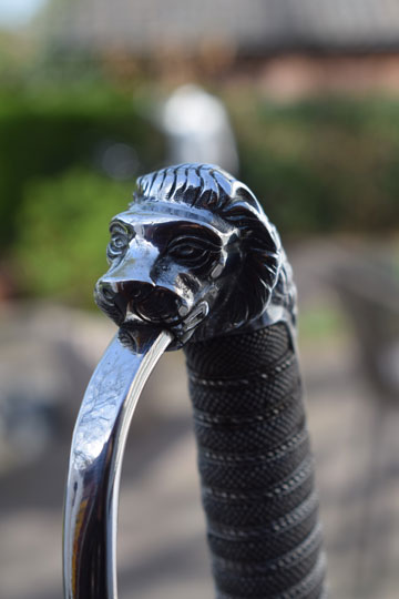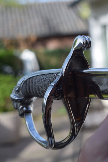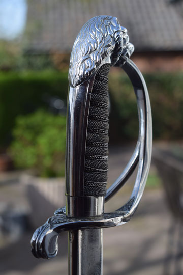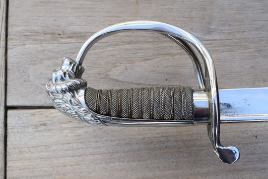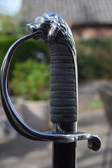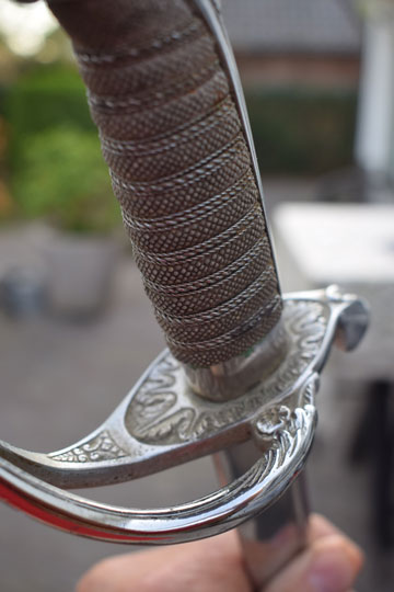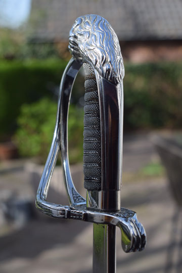 "Politie sabel van de Gemeente Politie ca. 1900". / Dutch Municipal Police short sword, around 1900. Superb bright plated pipe back blade. The crossguard shows a very faint trade mark of the German maker. Only the sword and a part of the H. are still visible. (= E. & F. HORSTER- SOLINGEN.  Excellent+ plated cast hilt. Large Dutch lion head pommel and a hilt with a hand guard and a single side bar. Beautiful grip covered with grey ray skin and a complex twisted silver wire windind.  Crossguard with a short forward swept quillon. Inside of the guard is fine decorated.