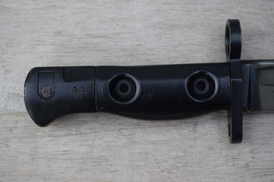 Semi-automatic rifle L1A1 Cal. 7.62 . Minty parkerized fullered Bowie type blade with long fuller. First cm blackened. British maker marking B and 60 (=BSA 1960) on ricasso. Blackened pommel is brazed to the tang and marked: /|\ B. Right side of the pommel is marked : 58 and the left side : 19. T- type mortise slot. L1A1 type crossguard with muzzle ring MRD 14.8. Blackened metal grips are both marked /|\ and are riveted to the tang. Both grips are NATO code marked: L1A3 960-0257 B (B = made by BSA - Birmingham Small Arms.) Some very light user spurs to the left grip only.