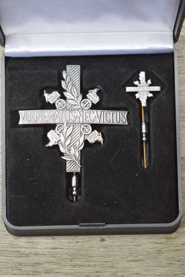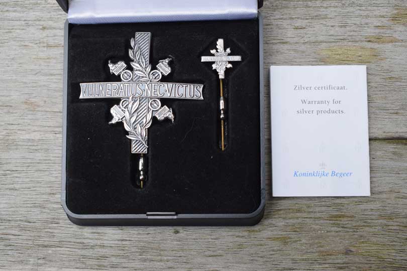 Dutch medal and pin for wounded military personnel. Minty and complete set in its original black box of the silver medal (draaginsigne) and pin for wounded solders. Introduced in 1990 and awarded to all military personal wounded in action after 1940. The medal and pin both read: VULNERATUS-NEC-VICTUS.