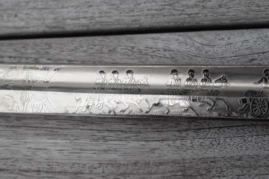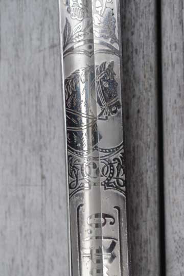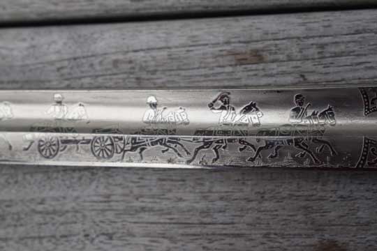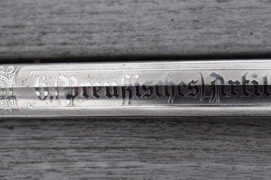 German (Prussian) M 1849 walking out Artillery officers dress sword. Weimar Republic - Reichswehr. Beautiful bright finished curved blade, deep etched on both sides. Red felt washer intact. Right side shows a mounted charging officer with a Stahl helmet, followed by: 6.(Preußisches) Artillerie Regiment in a box followed by a horse head. The left side shows a riding out Artillery group. Floral motives an two crossed swords. Blade spine with floral motives. Bright finished non detachable steel hilt (Not plated!) with a single P shaped hand guard and two languets. Dove head pommel. Back of the hilt with riveted "ears" and a wooden grip covered with black celluloid and an intact complex copper wire winding.