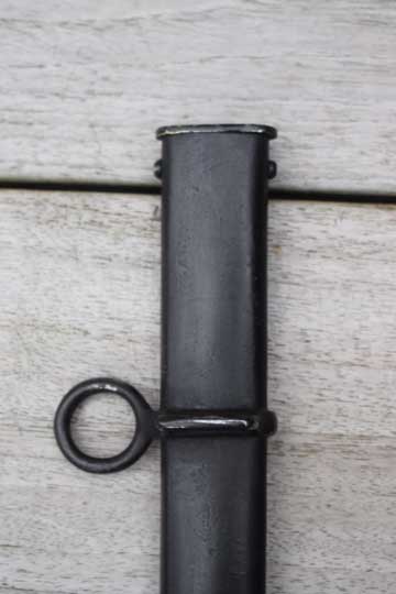 Excellent blackened steel scabbard with a single fixed hanging ring and no dents.