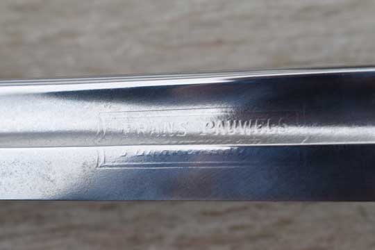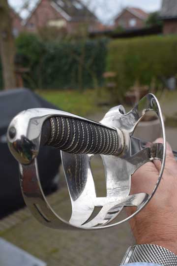 "Nederlands Cavalerie Officierssabel M 1876. Lange sabel No.2./ Dutch Cavalry officers sword M 1876. No.2. Excellent+ curved fullered bright finished blade. Intact black leather washer. Dutch retailers name and residence: FRANS PAUWELS over 's GRAVENHAGE (= Frans Pauwels, Hoofdstraat, Den Haag 1874-1925) in a box on the blade side. The Dutch proof mark: YZERHOUWER in a scroll on the reverse. Excellent bright finished plated steel hilt, plated steel hand guard with knuckle bow, three side bars and a forward swept quillon.