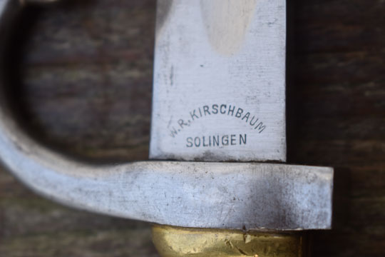 Argentine M 1891 Mauser Cavalry carbine Cal. 7,65 x 53 mm. Serial number: B 2534 Matching! on the ricasso. Excellent+ shortened fullered bright finished blade. German makers naam: W.R. KIRSCHBAUM in an arch over SOLINGEN crisp on the ricasso. Excellent ribbed brass grip with external spring. Bright finished crossguard with modified and flattened muzzle ring and forward swept quillon. Excellent shortened blued scabbard, made from the upper part and the lower part, welted together. Matching serial number: B 2534. A single small dent near the tip only.