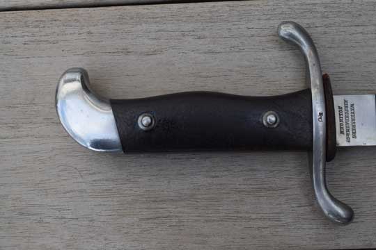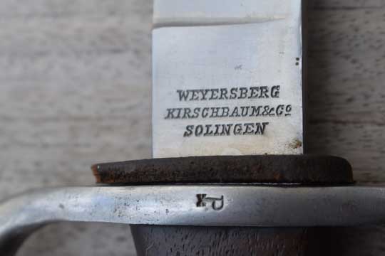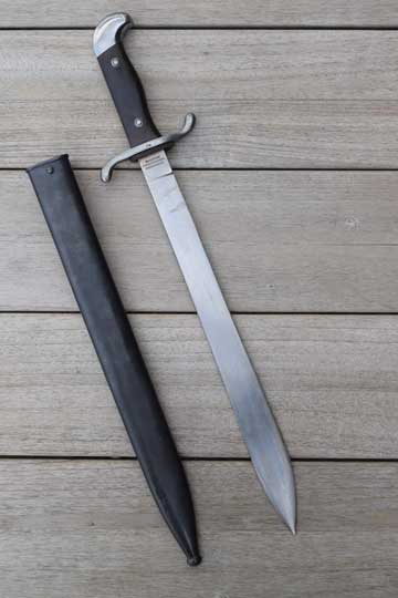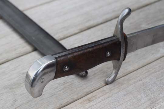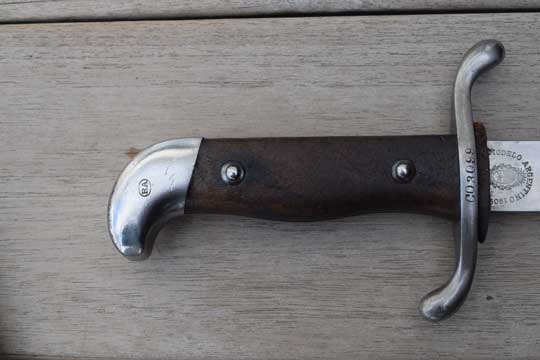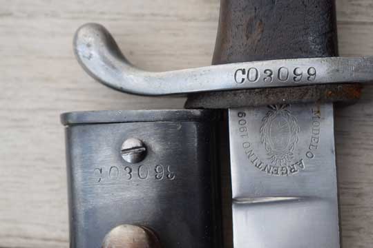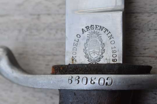 Argentine M 1909 Artillery short sword. Serial number: C 03099 Matching. Superb bright finished plain bolo blade with the intact Argentine Crest and MODELO ARGENTINO 1909 in an arch crisp on the right ricasso and the German maker's name WEYERSBERG - KIRSCHBAUM & Co. - SOLINGEN in three lines on the left ricasso. Blade spine is marked: A. Intact leather washer. Excellent bright metal pommel with crisp stamp RA in an oval. Bright crossguard with symatric quillons and serial number C 03099 and PX on the reverse side. There is a CX marking on the crossguard facing the blade. Excellent wooden grips secured to the blade tang with two rivets.