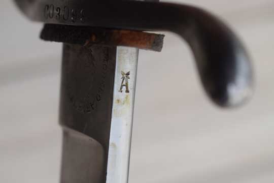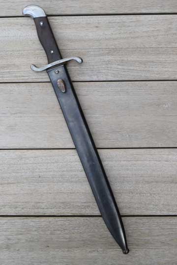 Excellent+ matching blued metal scabbard with an oval frog stud and no dents. Two inspection markings on the throat piece.