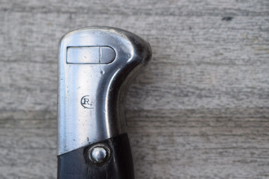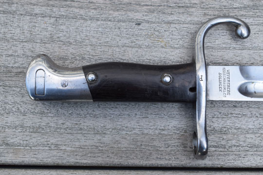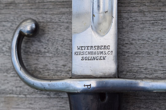 Excellent++ long bright fullered blade with very crisp German maker's name WEYERSBERG-KIRSCHBAUM & Co -SOLINGEN in three lines on the ricasso. Argentine crest filed out leaving only Modelo Argentino 1909 and the serial number on the ricasso. A (= Argentina) on blade spine. Excellent bright pommel with TO slot. Pommel is marked RA in an oval. Crossguard with guillon and muzzle ring MRD 15.5 mm. Crossguard is marked P and C marking facing the blade. Beautiful wooden grips secured to the blade tang by rivets. Oil hole in grips.