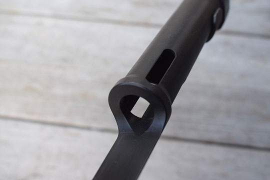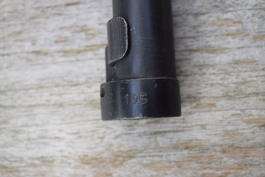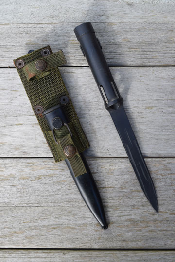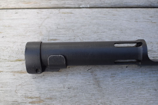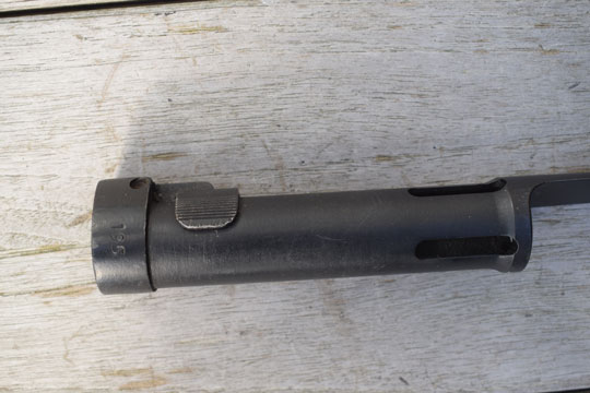 Argentine made FAL automatic rifle. Serial number: 193. Near mint parkerized blade with a flat upper side and a round underside. Excellent blackened long cylindrical socket made out of one piece. Four slotted openings and ribbed press catch.