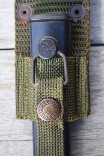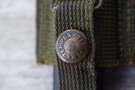 Comes with its exclusive Argentine green khaki frog with a black plastic backside fixed with four large brass rivets. Two green khaki straps with brass press button marked TEMPEX X TEMPEX. One strap keeps the scabbard in position the other one retains the tubular hilt. Lace opening in final.
