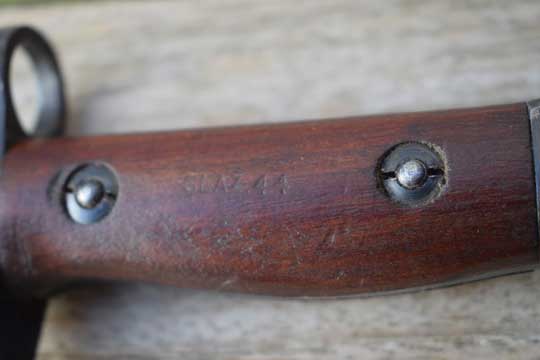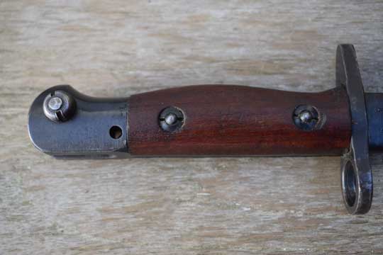 British M 1907 SMLE MKIII rifle. 2e model. Minty shot blasted finished fullered blade with Australian maker's name: MA over 1907 (= Munitions Australia- Orange Arsenal) and date: 5 ’44 on ricasso. Reverse side is marked /I\, X, OA. No false edge. Parkerized pommel and crossguard with muzzle ring MRD 16,5 mm. Large oil hole in pommel. Excellent wooden grips both marked SLAZ.44.
