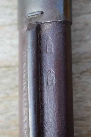Minty WWII Australian made dark brown leather No.I MkII scabbard. Leather body with all stitches intact is marked: MANGROVITE/'44 and /I\ over B and another /I\ over B. No dents to the parkerized fittings. Top mount with three rivets and Large round frog stud. Both fittings with OA (=Orange Arsenal) markings.