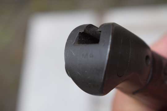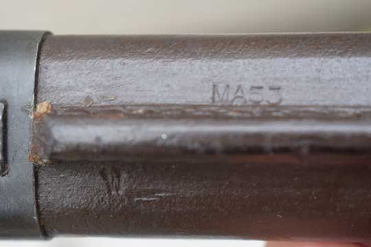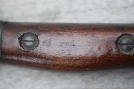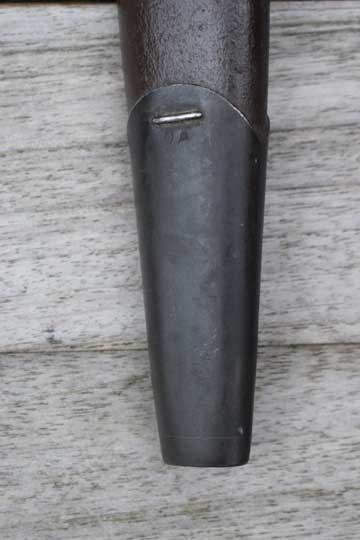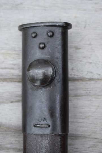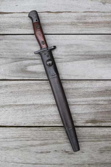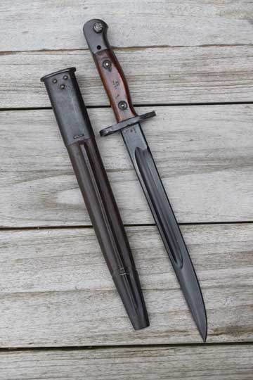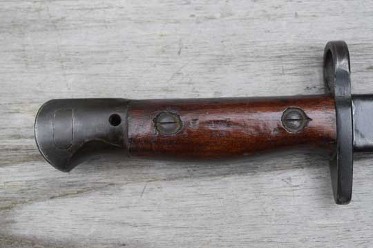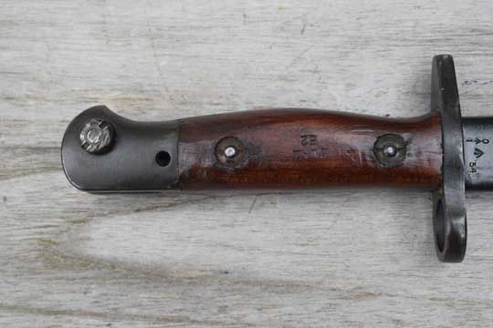 Australian M 1943 Mk I Owen SMG. Excellent parkerized fullered blade. The ricasso is crisp marked M.A.(= Munitions Australia- Orange Arsenal), and dated:'53, and X . Reverse side is marked /I\ 0/I\1 and'54. Excellent parkerised T-slot pommel and crossguard with muzzle ring. MRD 16,5 mm. Pommel is marked :MA. Excellent Australian type wooden grips both marked SLAZ '52. Oil hole in pommel.
