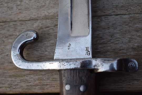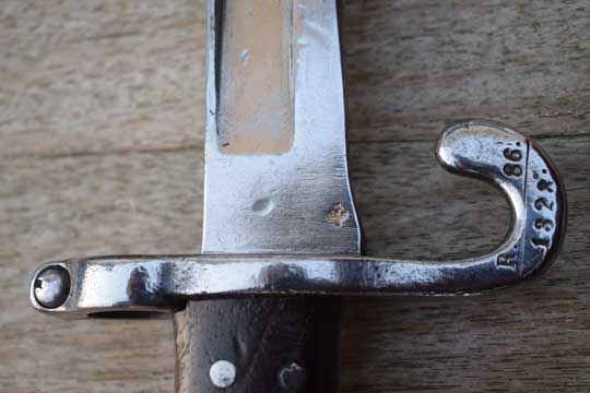 Austro-Hungarian Werndl rifle M 1867 and M 1867-77. Bayonet model 1870 Werndl Variation. Serial number: 1323. on quillon. Fantastic bright finished shortened fullered yatagan blade. Ricasso is marked: OEWG (= Steyer made), HW in an oval and an Austrian crest. The reverse side also shows an Austrian Crest. Bright finished pommel shows some peppering on the left side only. Grossguard with quillon. Quillon is Unit marked : R. - 86. over 1323. (= 86th. Infantry Regiment: Freiherr von Steininger. Garrison: Szabadka. Rifle nr.: 1323. )Muzzle ring: MRD 18.9. Muzzle ring with spanner on top. External spring. Large press button.